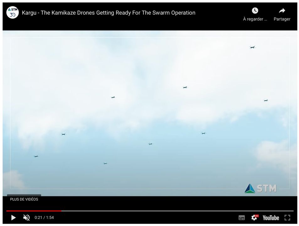 Surtout, Kargu 2 n’est pas un drone conçu pour opérer seul, mais en essaim. La vidéo ci-dessus montre un vingtaine de robots partant s’acharner sur une cible désignée par un seul ordinateur (GCS, dans la légende, pour gun-computer system). Ses origines de simple robot-sentinelle s’éloignent à tire d’aile.